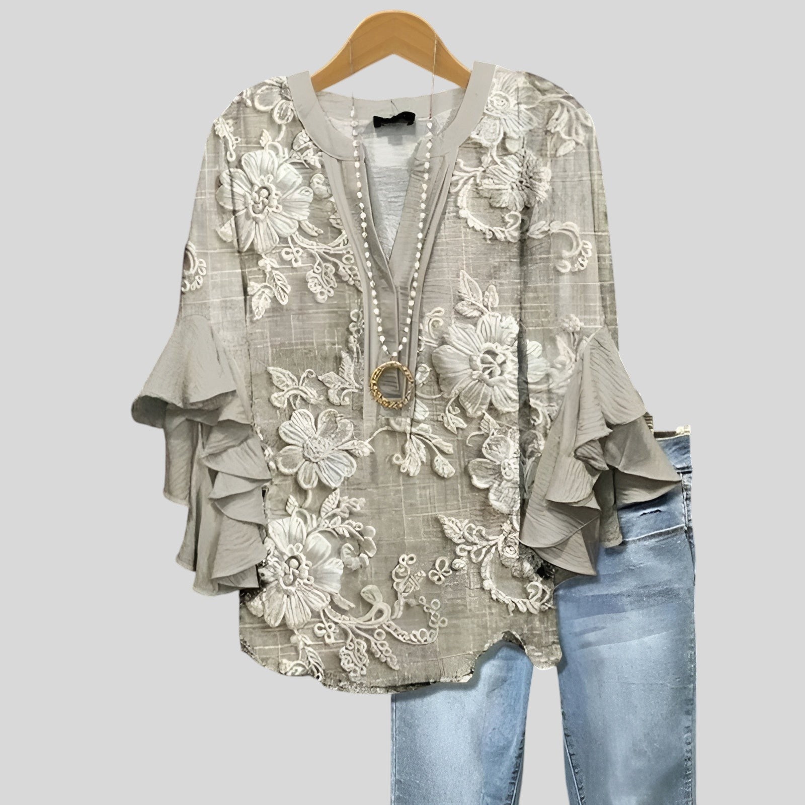 Deixe-se envolver pela leveza e pelo charme primaveril desta blusa. Com uma paleta de cores serena e um design delicado, esta peça é perfeita para quem procura um estilo fluído, romântico e sofisticado para a estação.