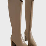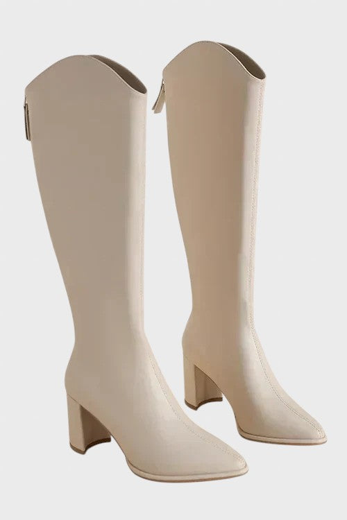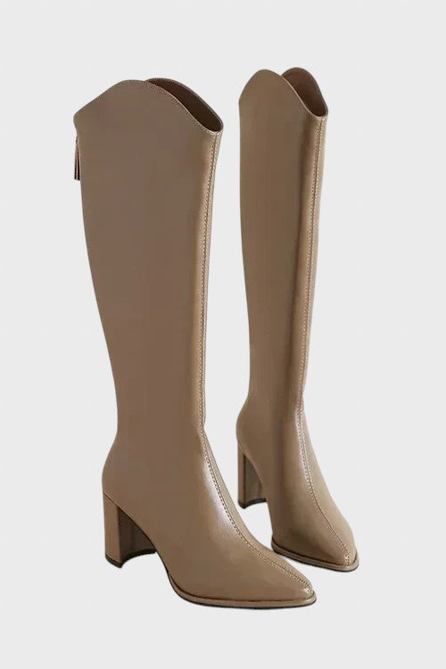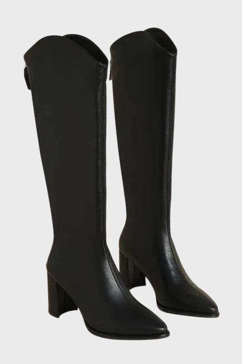 • Design impermeável: A bota apresenta uma silhueta alta e alongada, que é o seu principal ponto de atração. O topo do cano possui um corte em "V" que ajuda a alongar a perna e adicionar um toque de estilo cowboy modernizado. O bico fino, embora não seja extremamente pontudo, confere elegância e sofisticação, contrastando com a robustez do salto.