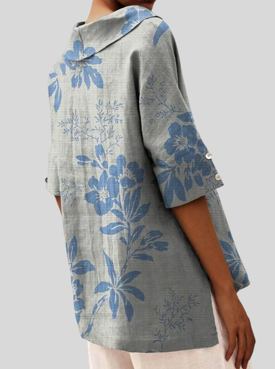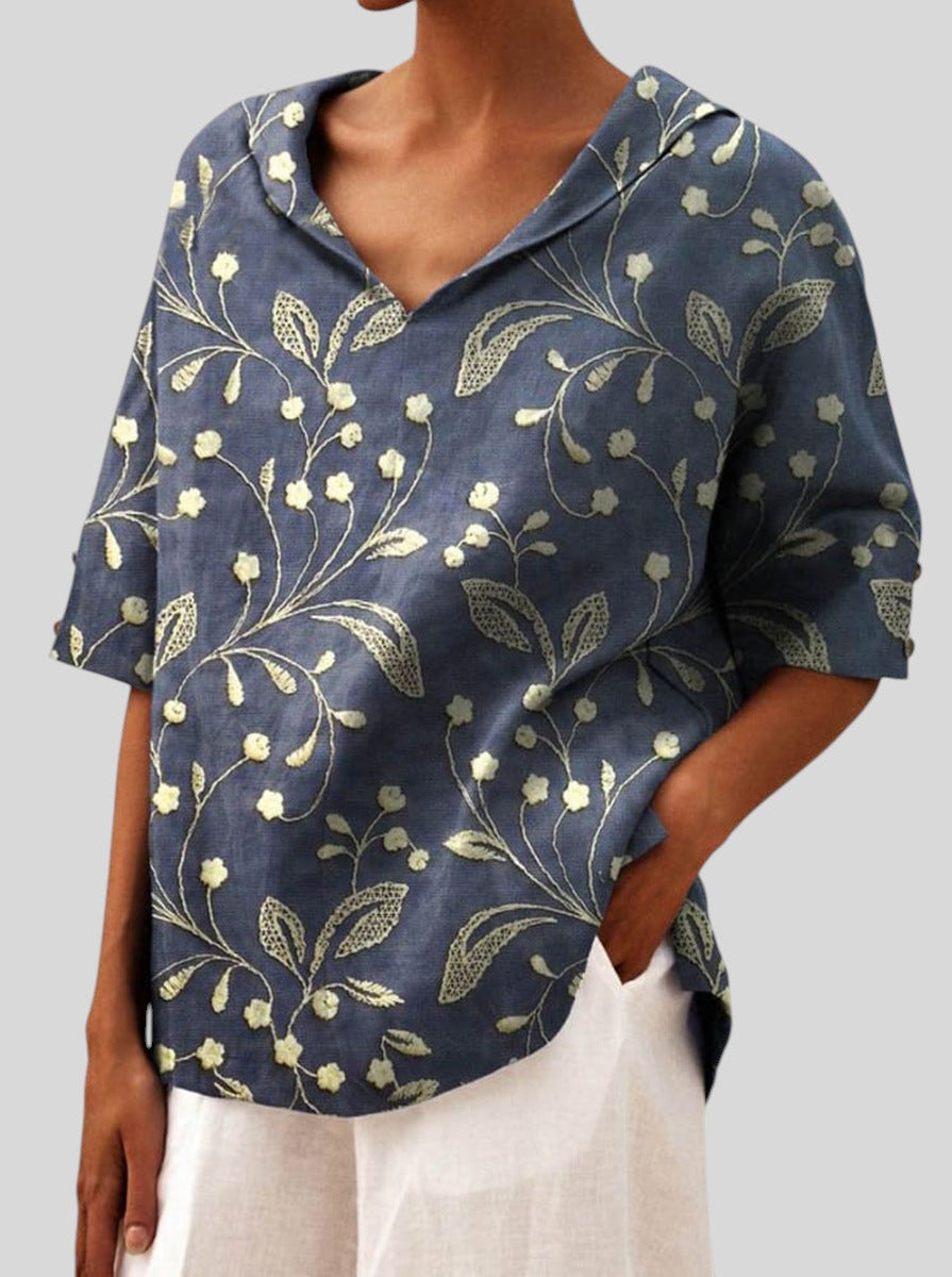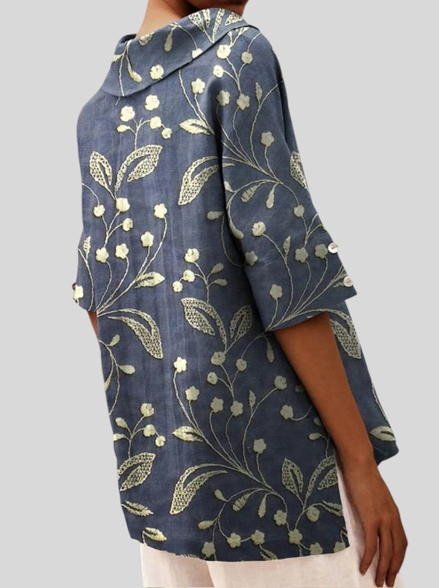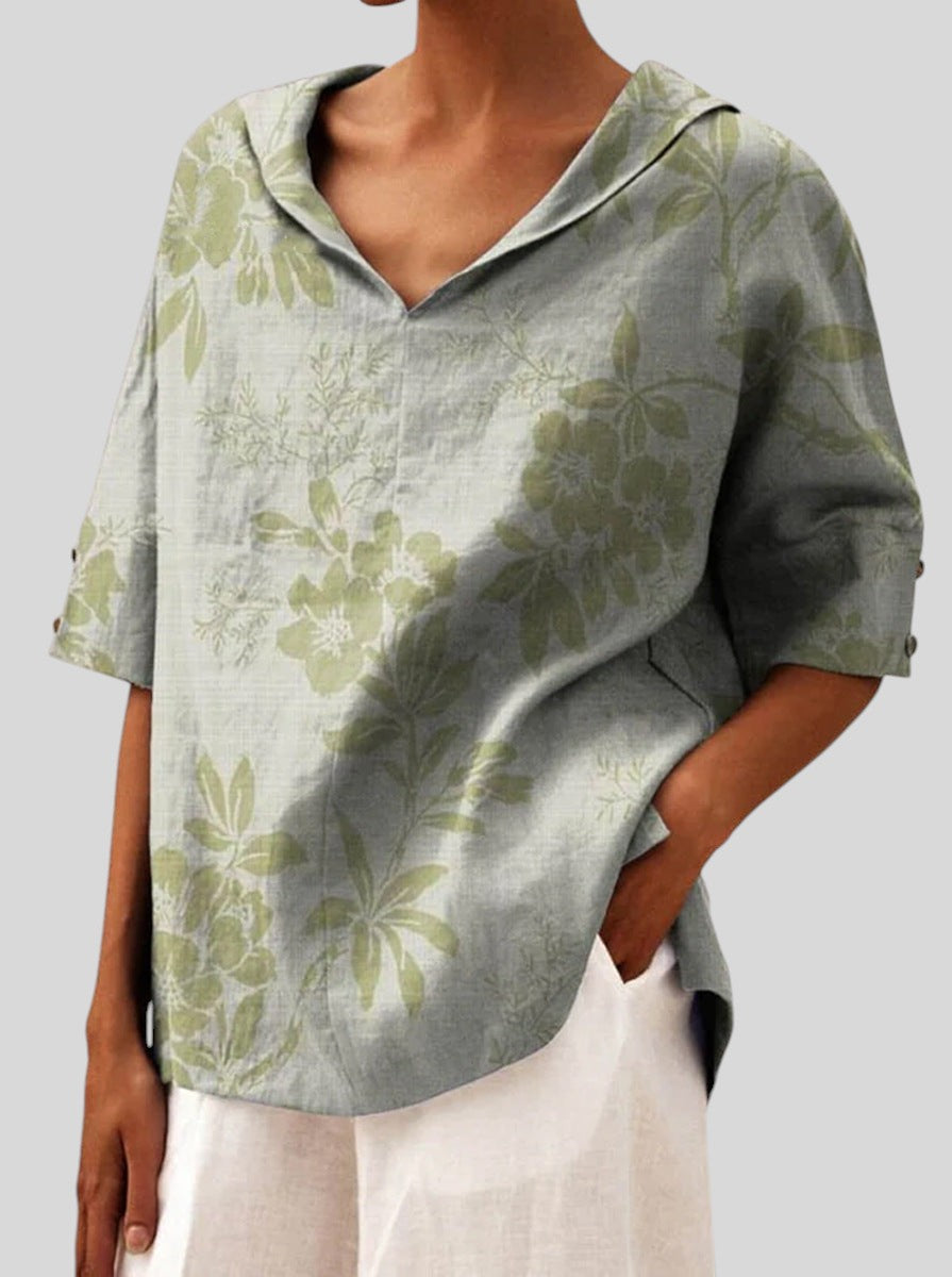Esta blusa é uma ode à simplicidade e ao conforto natural. Com um tecido feito de linho, o que lhe confere um aspeto ligeiramente texturizado e descontraído, sendo ideal para um look casual e elegante.