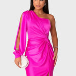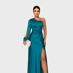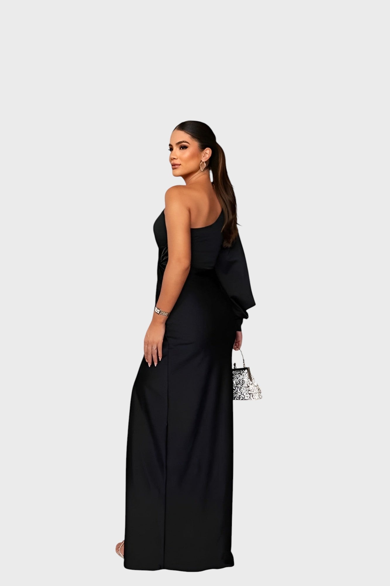 • Design Assimétrico Dramático: O destaque é o design de um ombro só que confere uma elegância instantânea e contemporânea. A alça prolonga-se em uma manga solta e levemente aberta, criando um efeito de capa moderno e sofisticado.