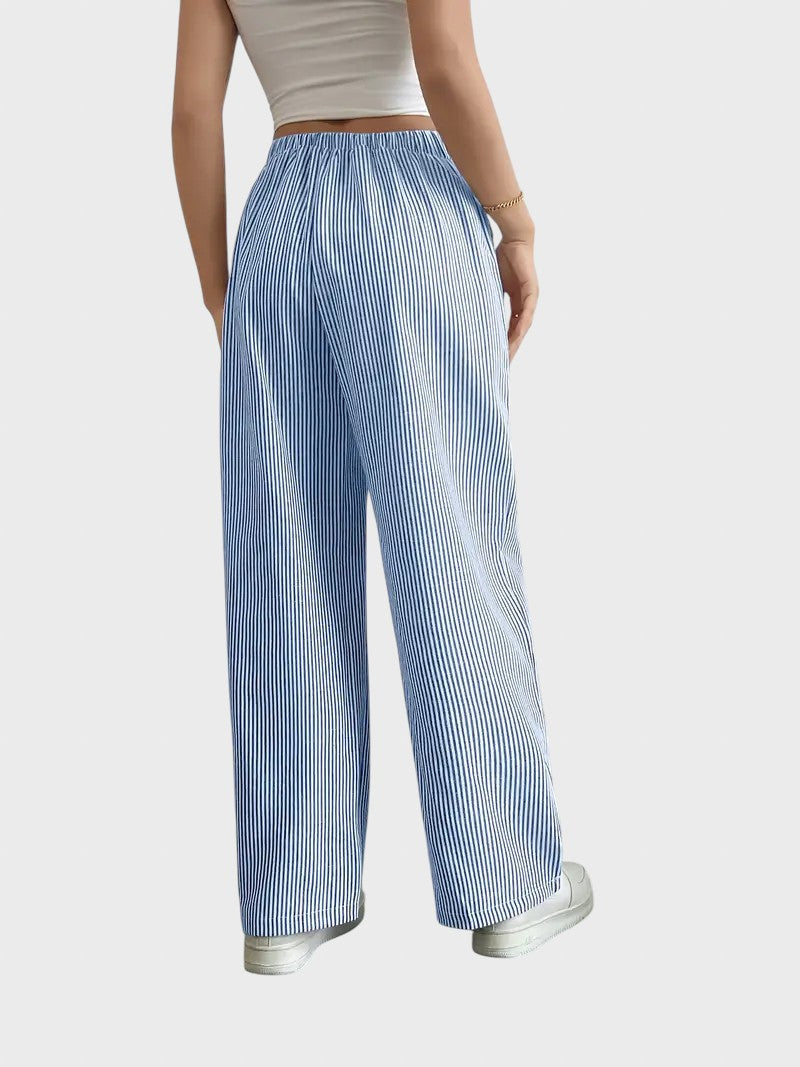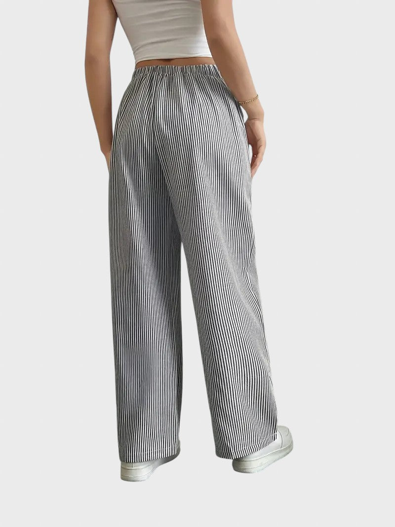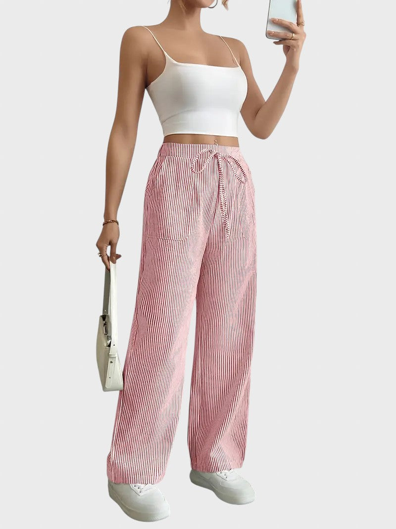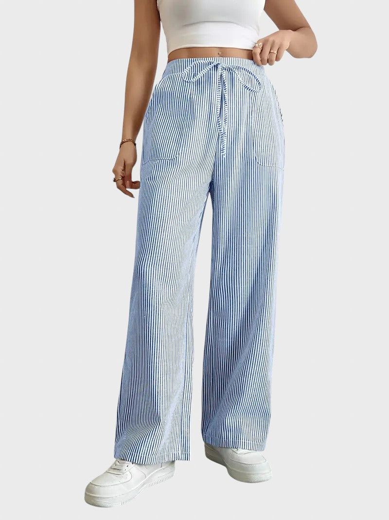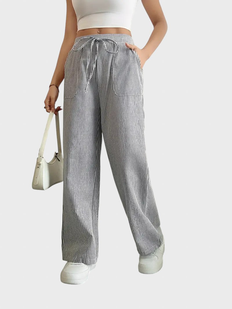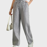 Ideal para os dias mais quentes, estas calças combinam o frescor de um tecido leve com um padrão clássico de listras. É a peça perfeita para criar looks descontraídos, resort-chic e extremamente confortáveis, garantindo um visual elegante com o mínimo esforço.