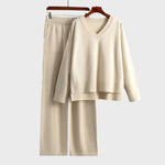 Confeccionado com uma mistura de tecidos suaves e respiráveis, este conjunto garante conforto durante todo o dia, permitindo-lhe manter-se elegante sem esforço. A camisola com gola em V e as calças jogger de cintura alta com cordão criam a combinação perfeita entre um ajuste informal e um estilo refinado. A parte superior ampla e as calças largas oferecem uma silhueta que valoriza todos os tipos de corpo.