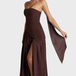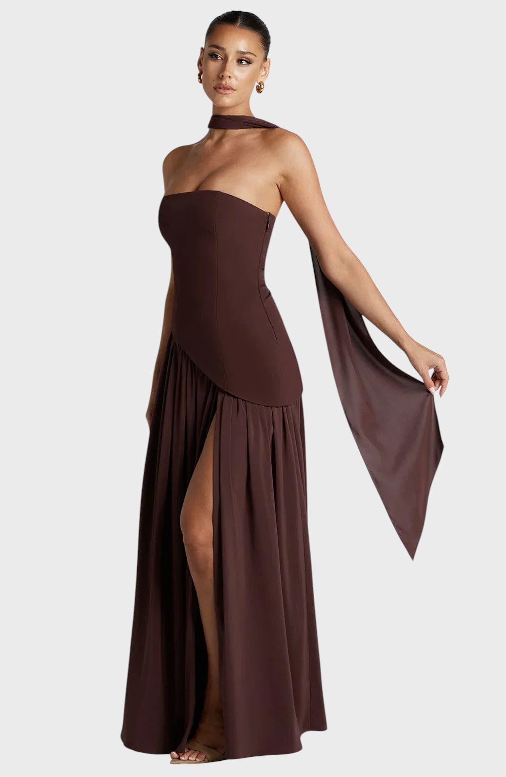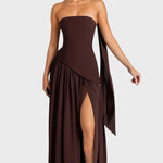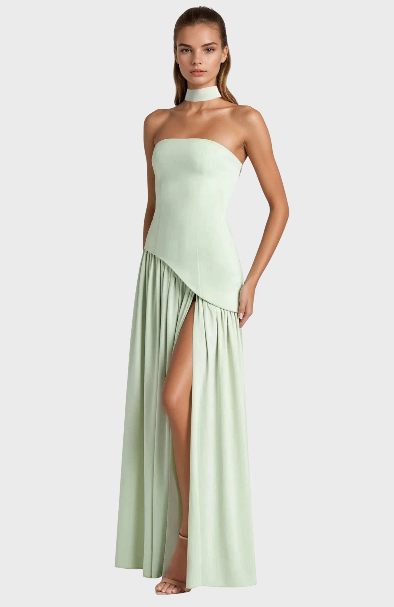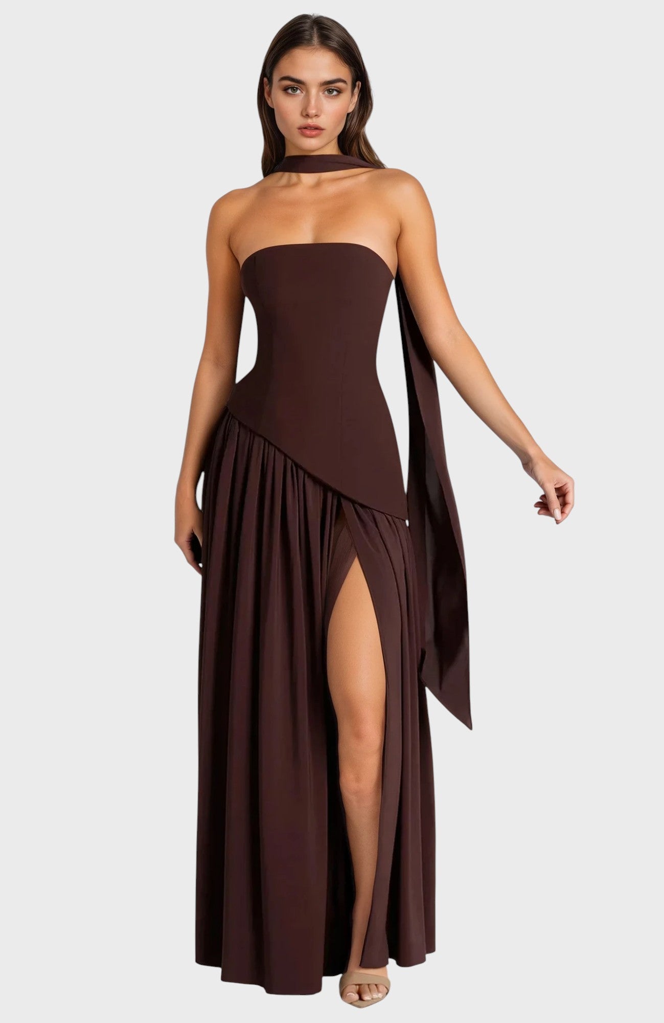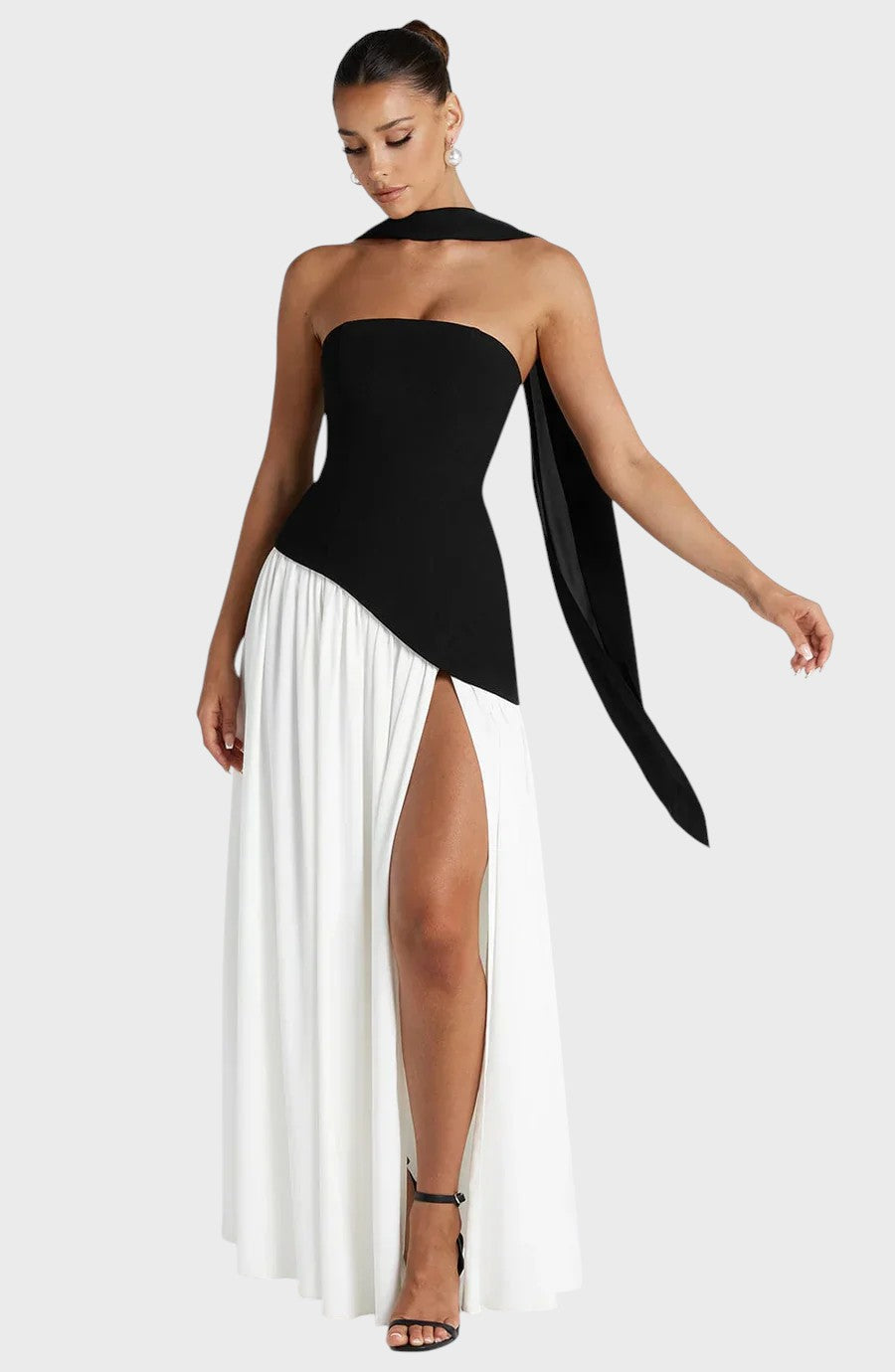 • Design Versátil e Atemporal: O vestido apresenta uma cintura estruturada e assimétrica que desce sobre a anca, criando uma sobreposição elegante. A saia longa e fluida garante um movimento leve e dramático a cada passo.