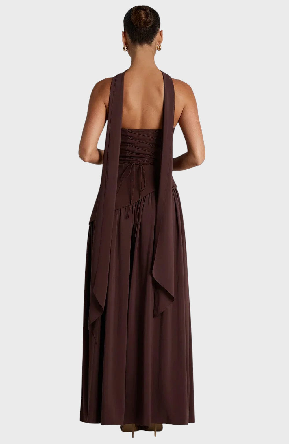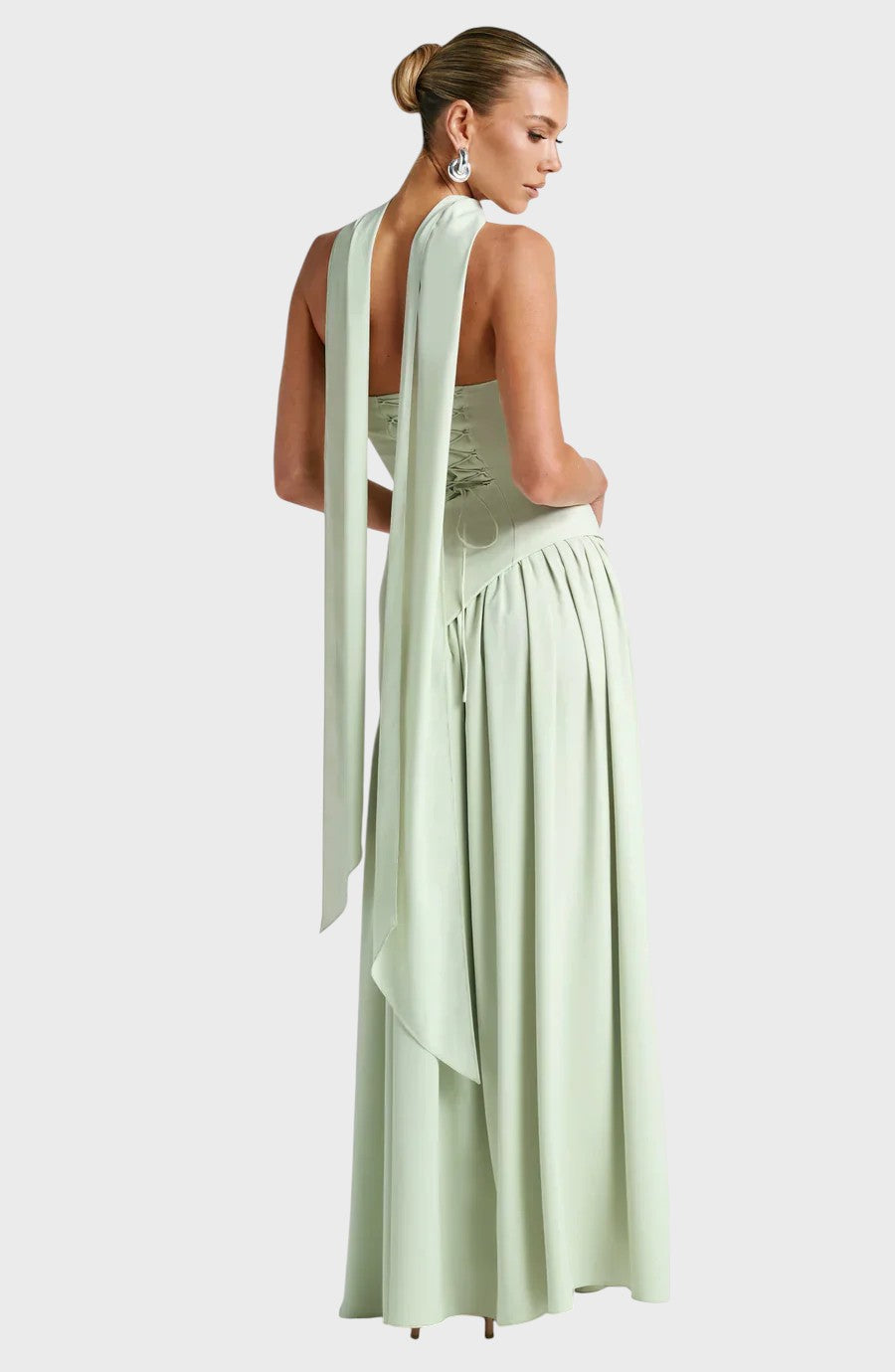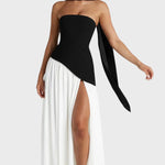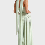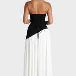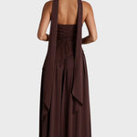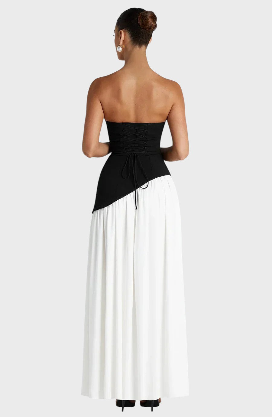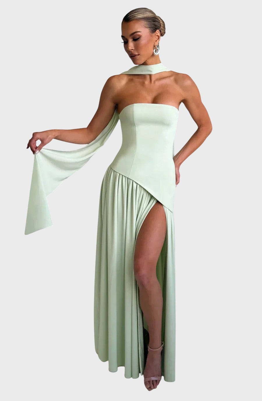 • Design Versátil e Atemporal: O vestido apresenta uma cintura estruturada e assimétrica que desce sobre a anca, criando uma sobreposição elegante. A saia longa e fluida garante um movimento leve e dramático a cada passo.