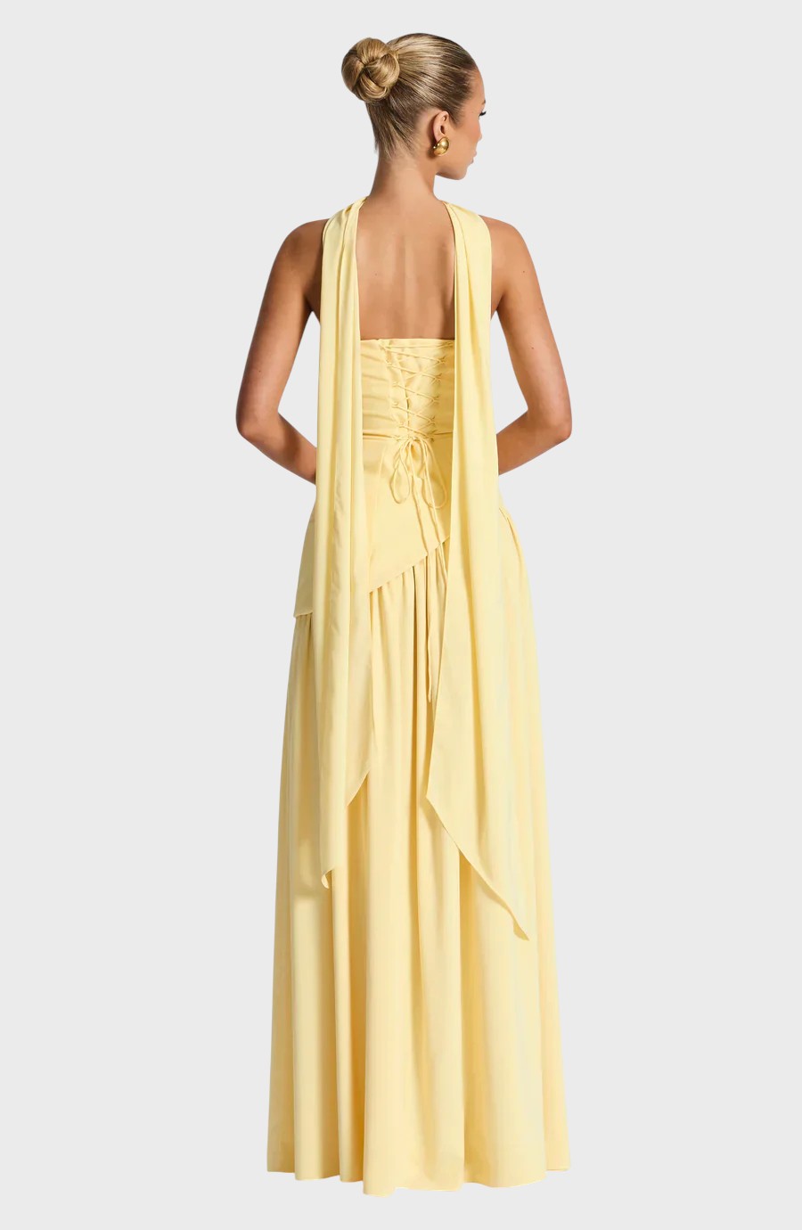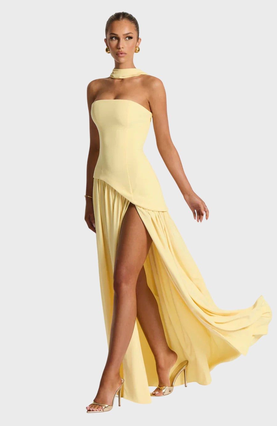 Deixe a elegância radiante encontrar o design arrojado com este deslumbrante vestido. Esta peça é a celebração do glamour contemporâneo, combinando um corte estruturado e minimalista com detalhes sensuais. É o modelo ideal para quem procura um look de alto impacto, perfeito para eventos de verão, galas ou qualquer ocasião que peça uma presença luminosa e confiante. Adicione uma aura de sofisticação ensolarada e moderna ao seu guarda-roupa.
