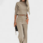 Este conjunto é a escolha perfeita para quem procura um visual elegante e contemporâneo com um toque de ousadia. O top cropped aliado à calça de cintura subida cria uma silhueta sofisticada, ideal tanto para eventos descontraídos como para um look de trabalho com personalidade.