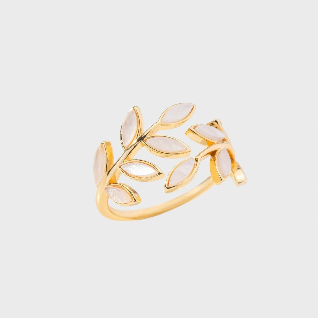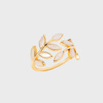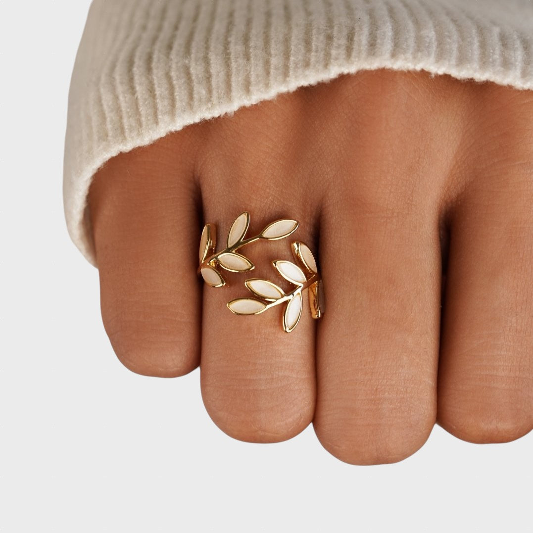 Este anel é uma ode à delicadeza e à força da natureza. Seu design envolvente, com folhas esmaltadas em branco e estrutura em tom dourado, captura a luz e a atenção. Ajustável e sofisticado, ele é a peça perfeita para quem procura um toque de glamour orgânico no dia-a-dia.