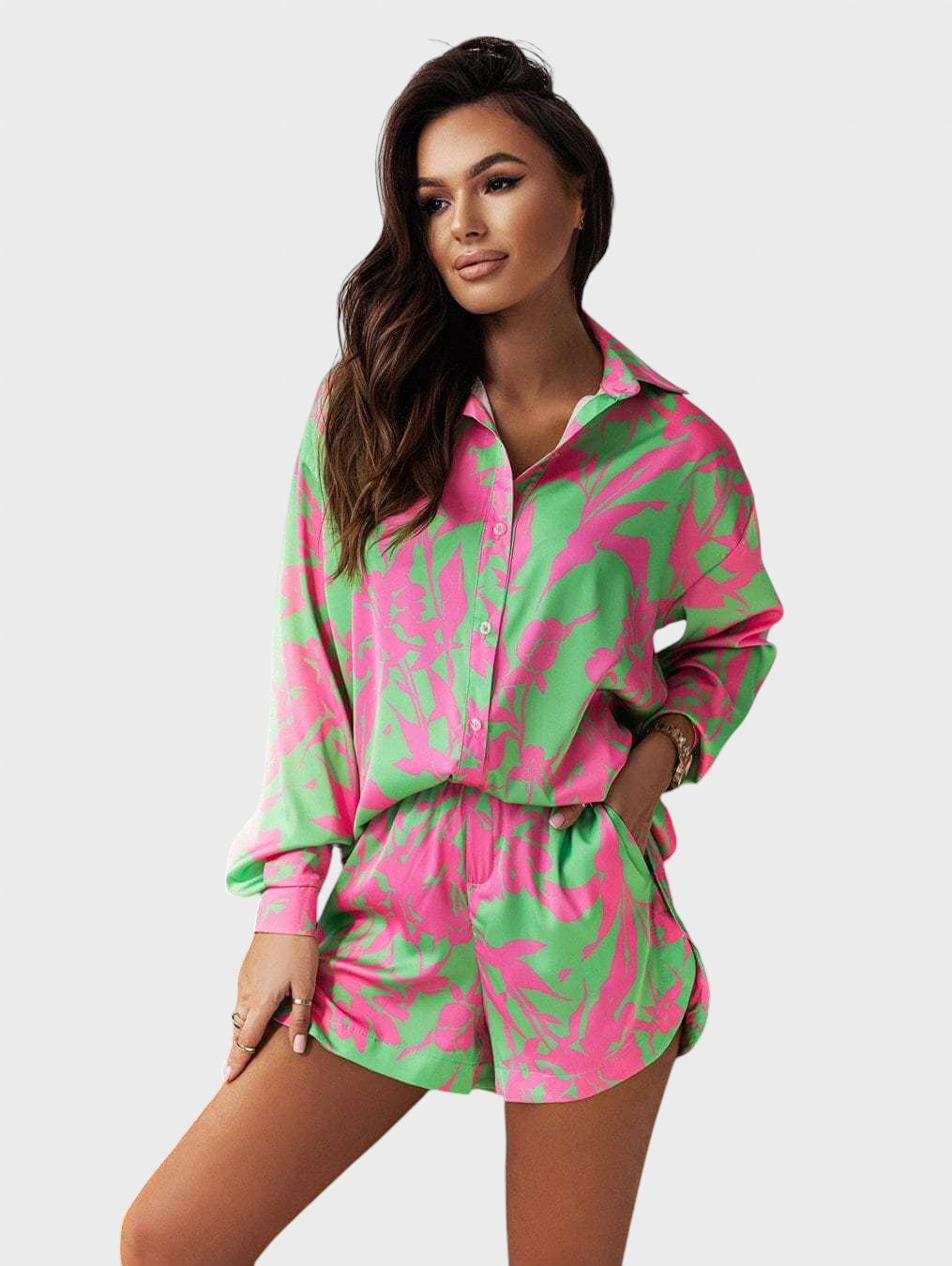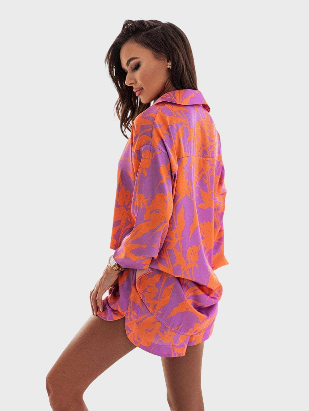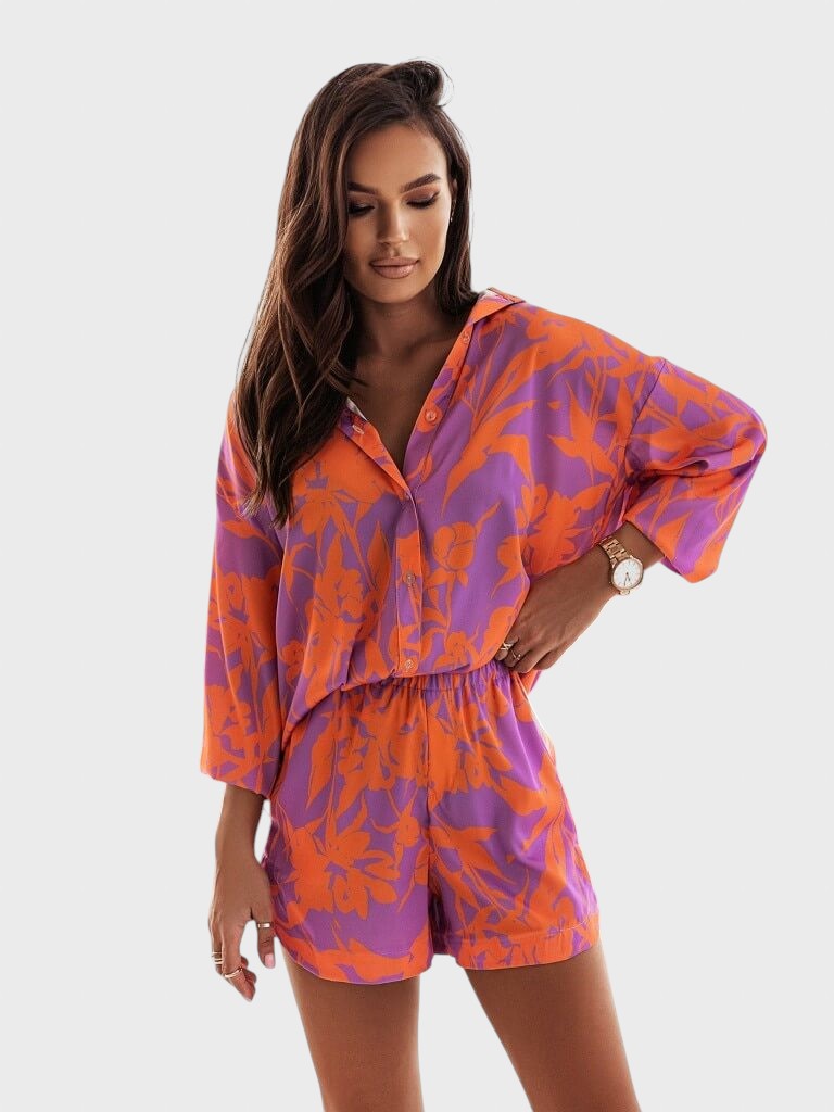 Entre no clima de férias com este conjunto coordenado de duas peças em cores vibrantes e um estampado divertido. É a escolha perfeita para um look de verão descontraído, mas cheio de estilo.