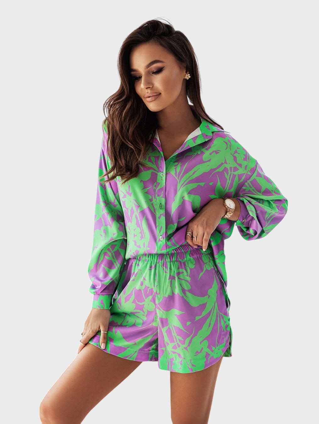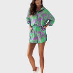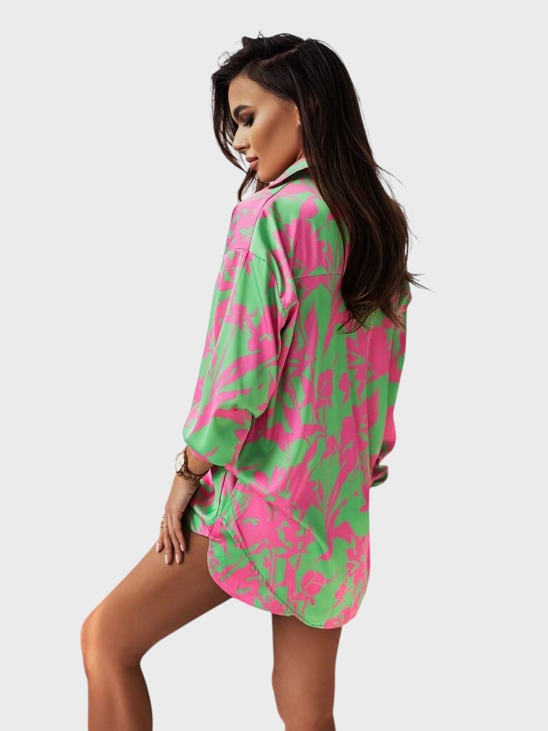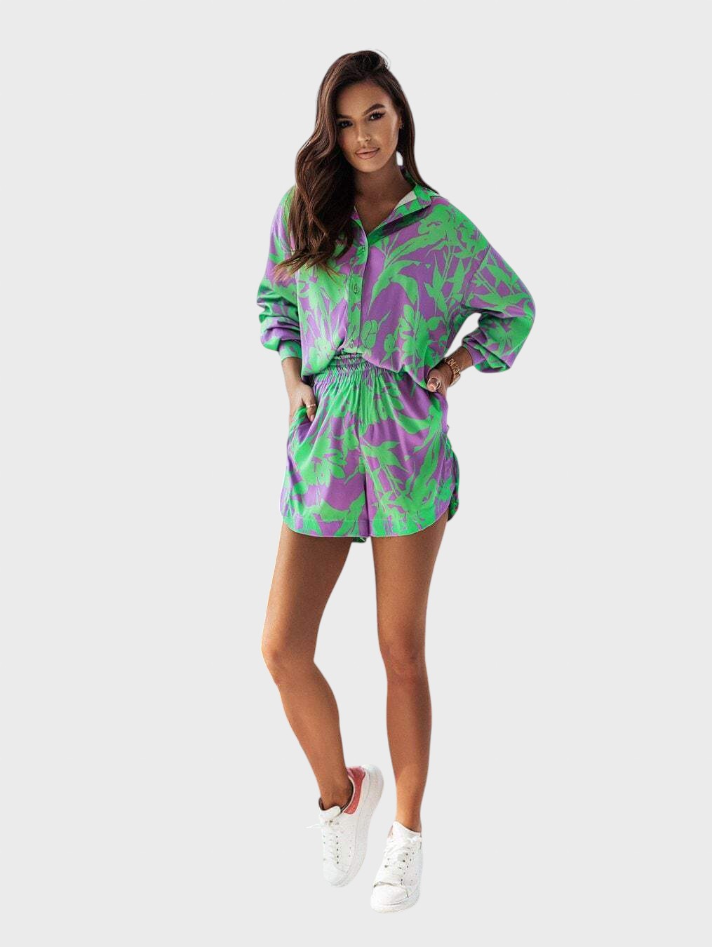 Entre no clima de férias com este conjunto coordenado de duas peças em cores vibrantes e um estampado divertido. É a escolha perfeita para um look de verão descontraído, mas cheio de estilo.