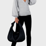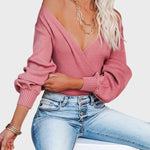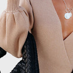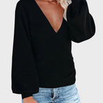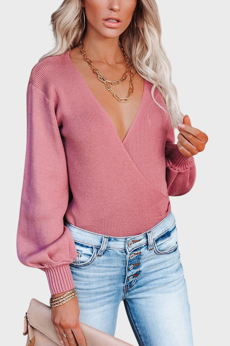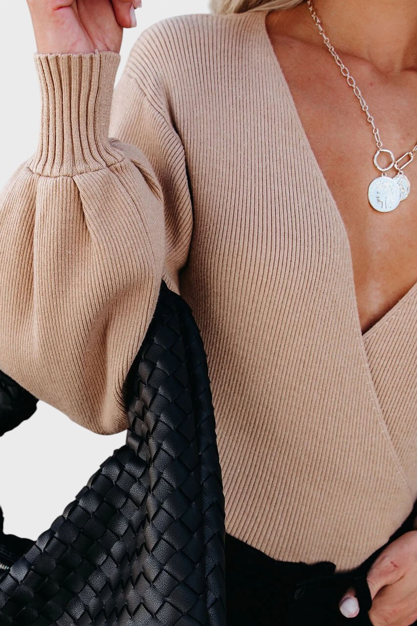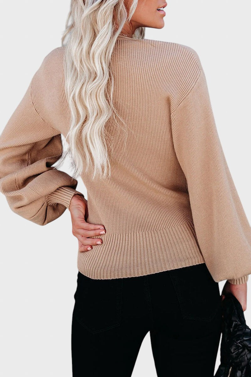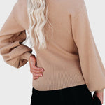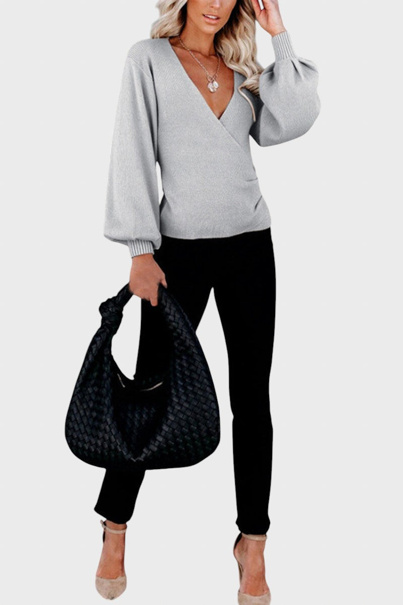 • Elegância sem esforço: A camisola apresenta um ajuste clássico e sofisticado graças ao seu design envelope com decote em V. Este estilo realça a silhueta de forma lisonjeira. As mangas balão são um detalhe elegante e moderno, terminando em punhos canelados ajustados que adicionam estrutura ao volume da manga.