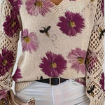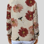 Esta camisola combina conforto e um design artístico, sendo a peça ideal para adicionar um toque de cor e textura ao seu look casual. O corpo da camisola apresenta uma malha densa em tom bege, que serve de tela para um padrão floral vibrante. As flores são grandes e de cores ricas, com pequenos detalhes que parecem ser abelhas ou insetos a voar sobre elas, dando-lhe um toque natural e lúdico.