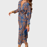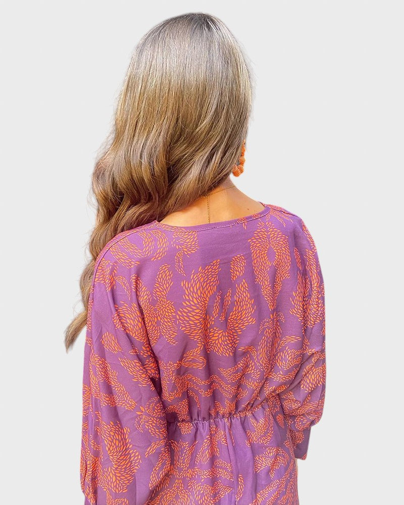 • Silhueta que se destaca: O charme da peça reside no padrão intrincado, na combinação de cores sofisticadas que eleva o vestido, conferindo-lhe um ar chique e uma presença marcante.