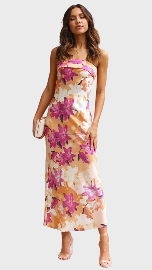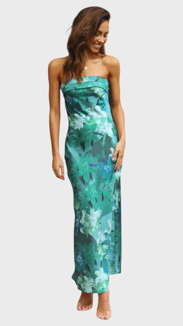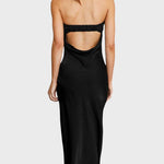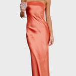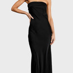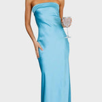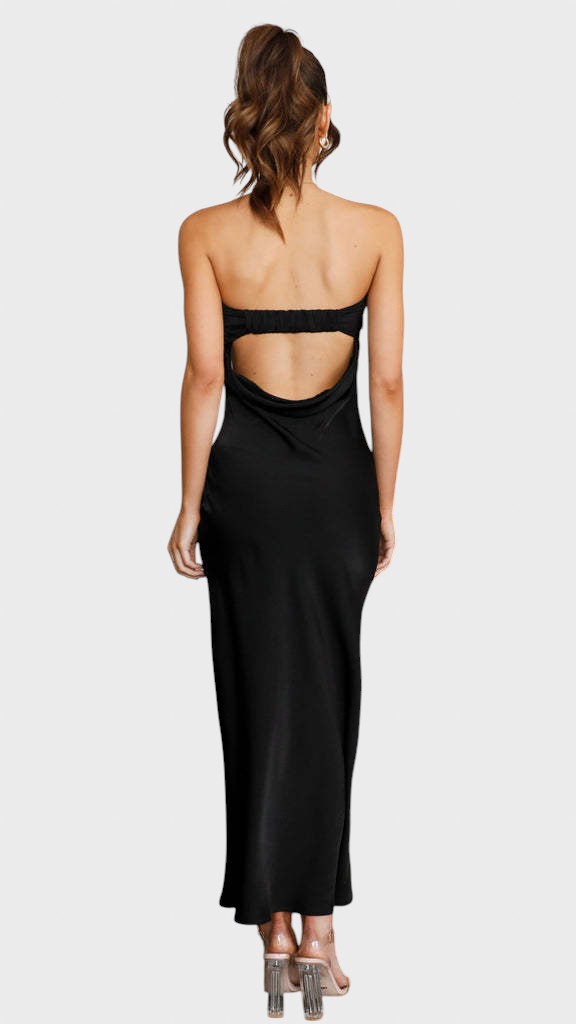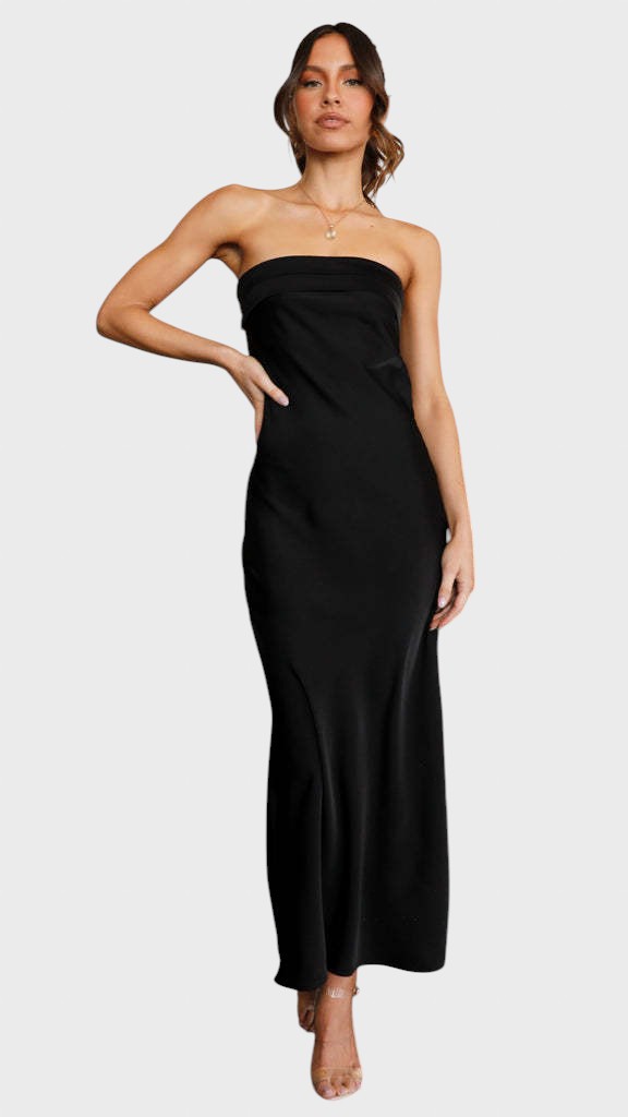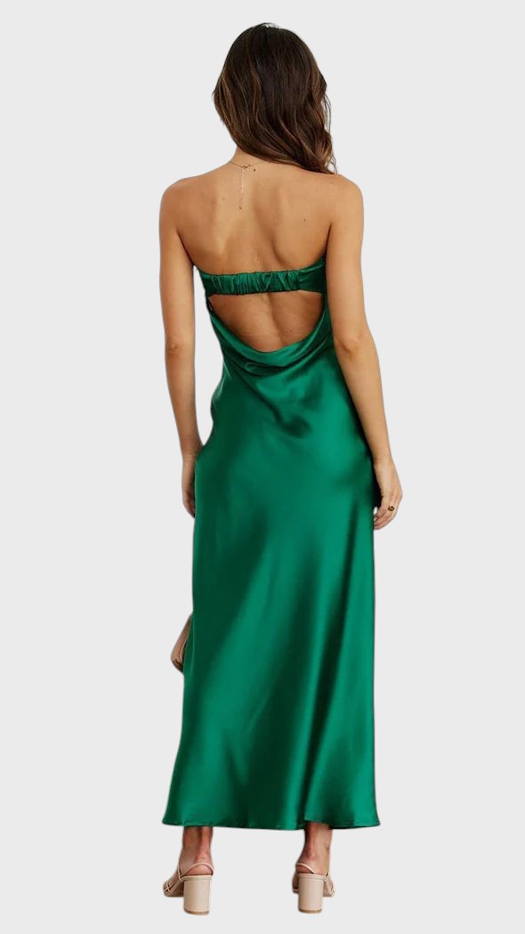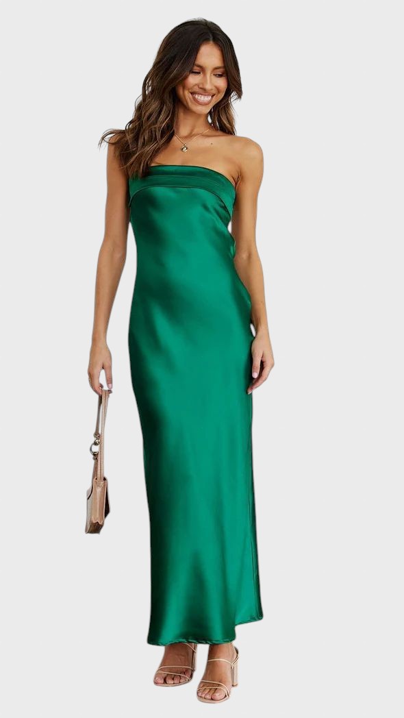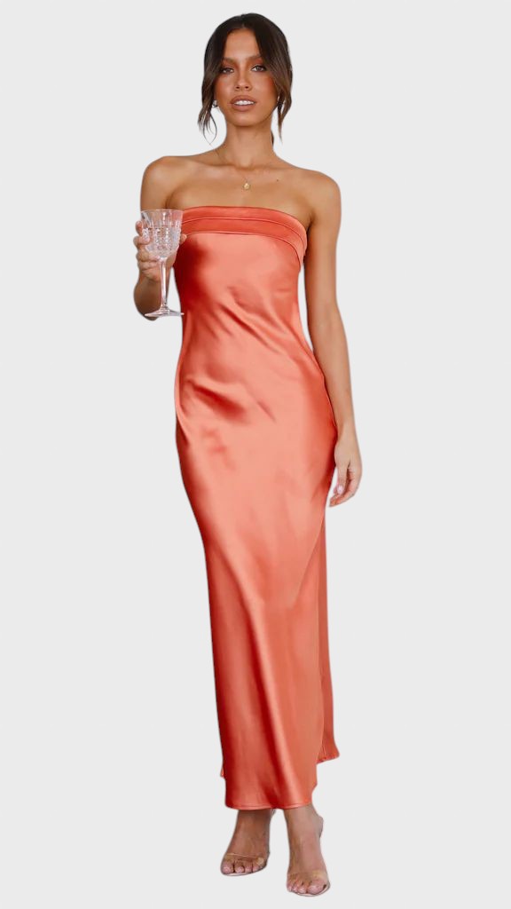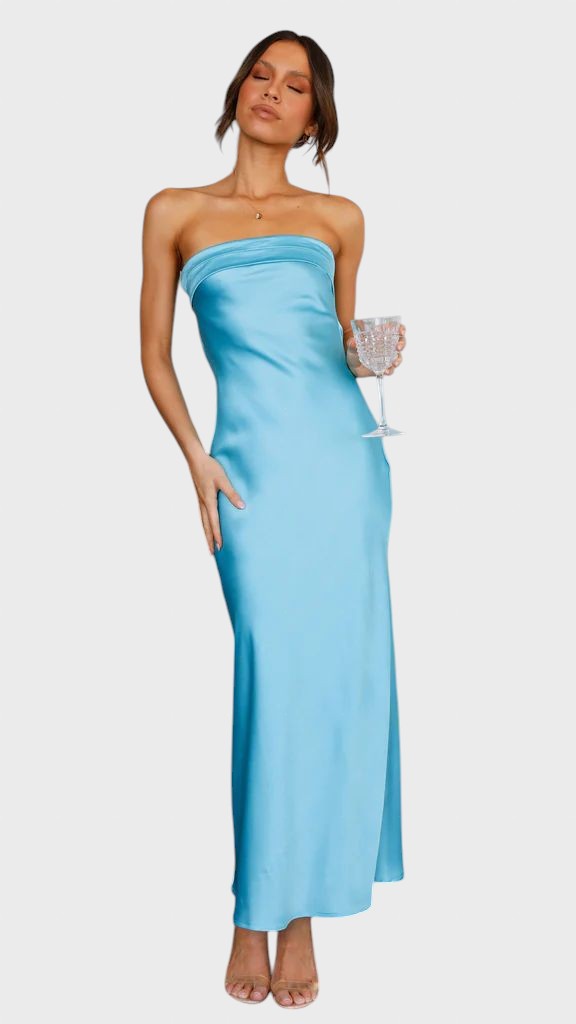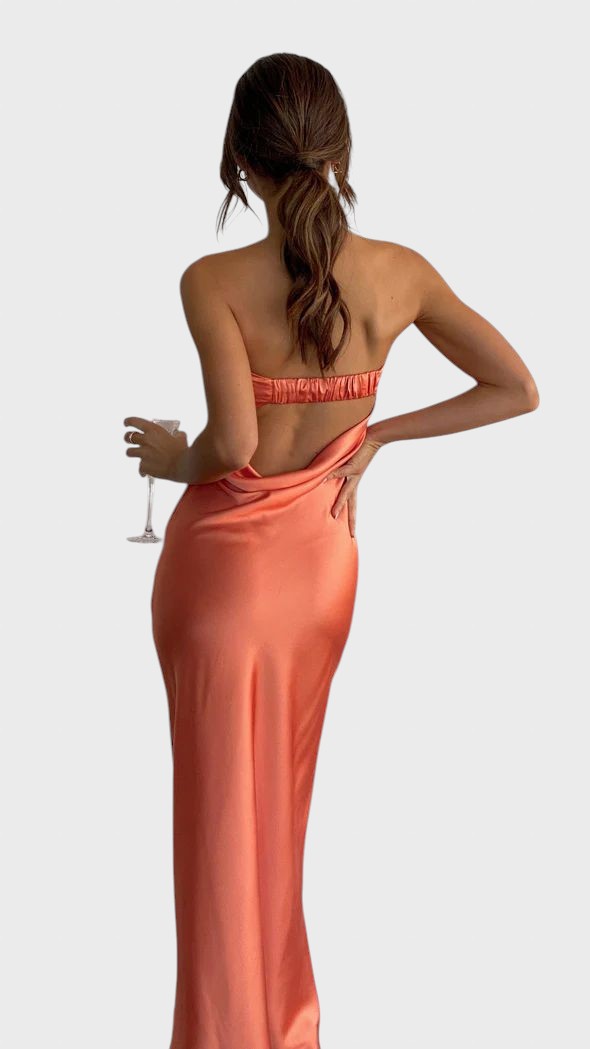 Sinta-se uma deusa suprema com nosso novo vestido longo! Este vestido é a definição de glamour minimalista, focando-se no caimento impecável e na riqueza do material. É um vestido cai-cai, com um decote reto e simples que realça o colo e os ombros.