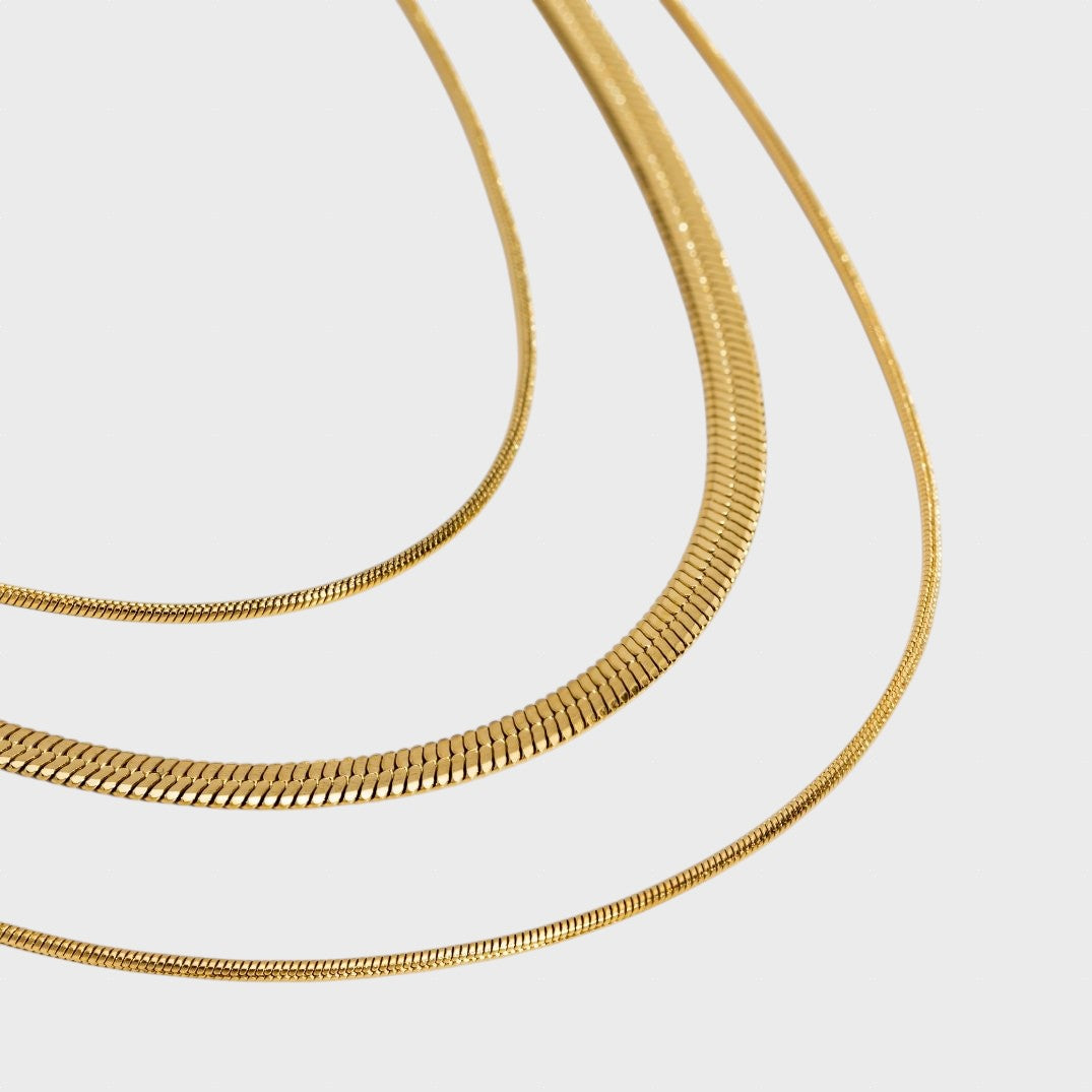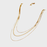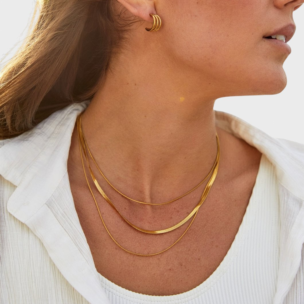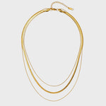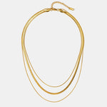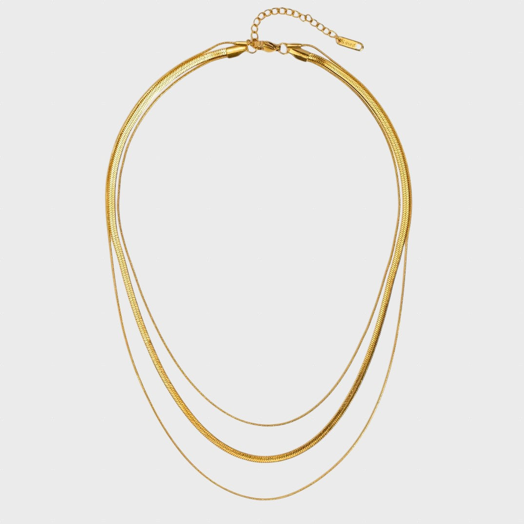 Este colar triplo combina três correntes de espessuras variadas, incluindo o popular e luxuoso design "espinha de peixe". O acabamento em ouro polido desliza suavemente sobre a pele, criando uma cascata de luz. É a peça-chave para quem procura o máximo de impacto e tendência com o mínimo de trabalho.